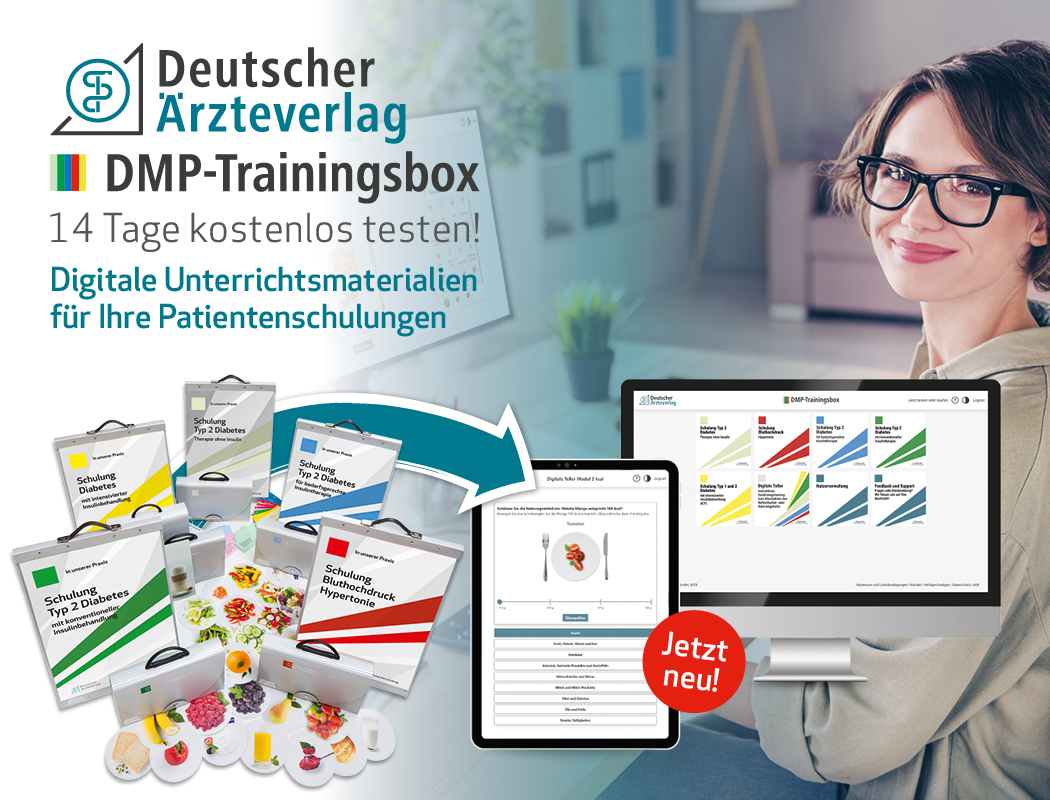 Testen Sie jetzt die digitalen Unterrichtsmaterialien der Zi-Schulungen für Diabetes und Hypertonie: 14 Tage lang, unverbindlich und gratis. Melden Sie sich einfach an unter praxisbedarf-aerzteverlag.de/dmp-trainingsbox.